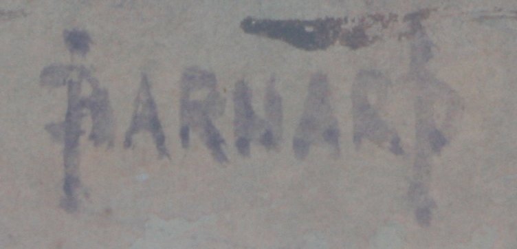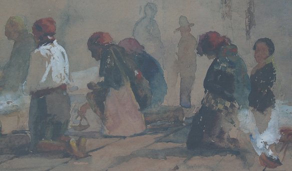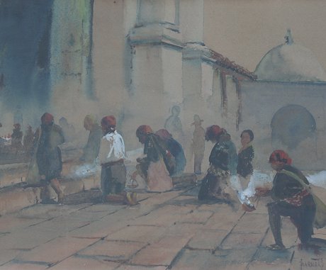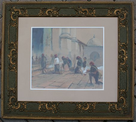 PRAYING AT A MOSQUE PAINTING SIGNED BARNARD: Watercolor, 13'' x 15'' sight size, gilded and painted relief gesso frame, 24 1/2'' x 28 1/2''. Est. $300/500**