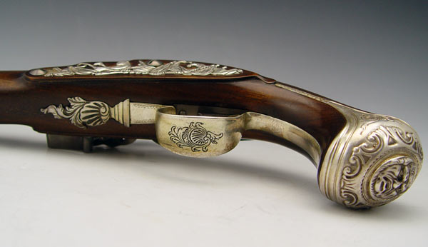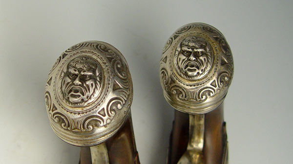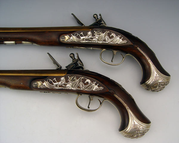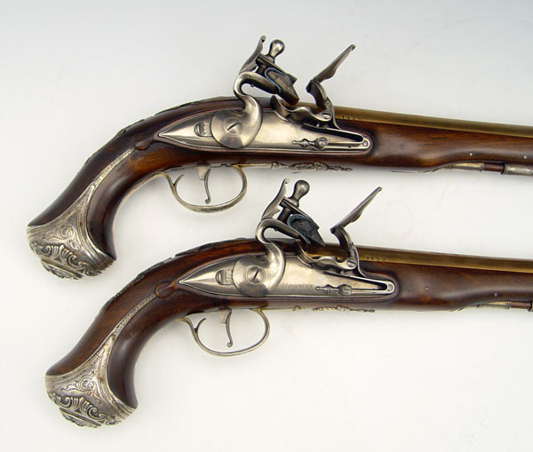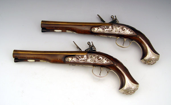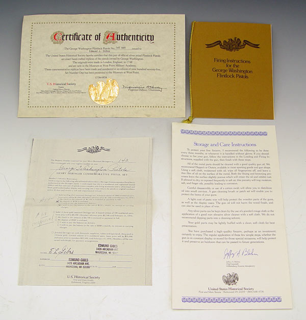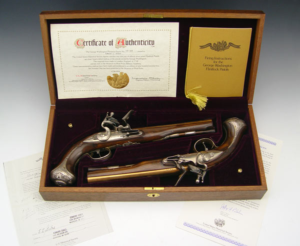 CASED REPLICA GEORGE WASHINGTON DUELLER PISTOLS: From the US Historical Society, released in 1976, exact silver inlaid replica's of the flintlock pistols owned by George Washington. Limited edition number 142 A & B of 975. Originally sold for $2500 new. Comes with case and Certificate of Authenticity. Case measures 3'' x 17'' x 8''.