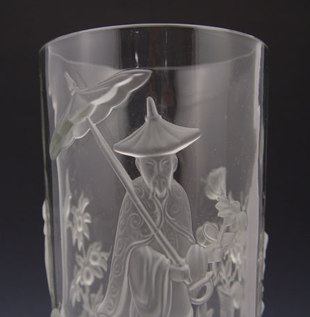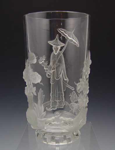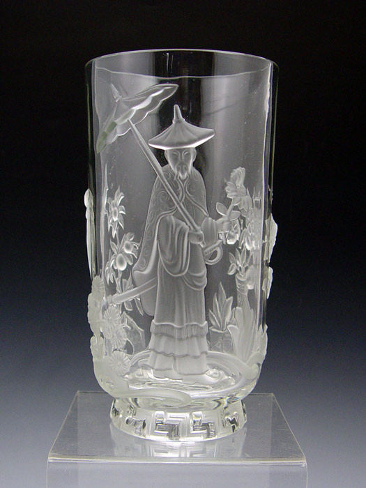 SIGNED VERLYS FROSTED GLASS ORIENTAL DESIGN VASE: 9 1/2'' x 5'' dia.