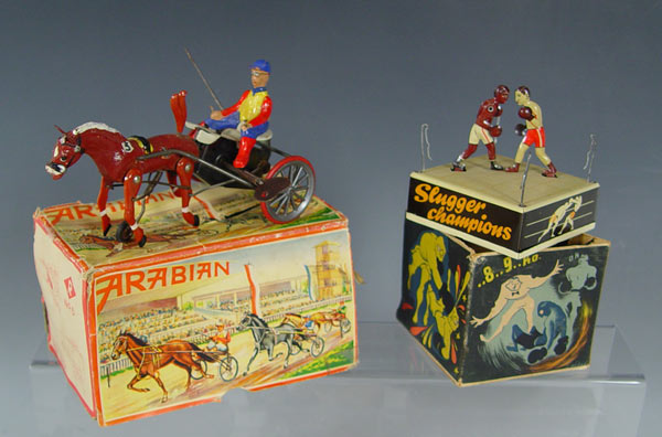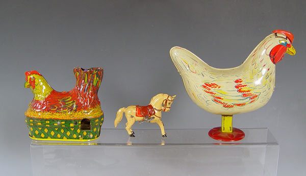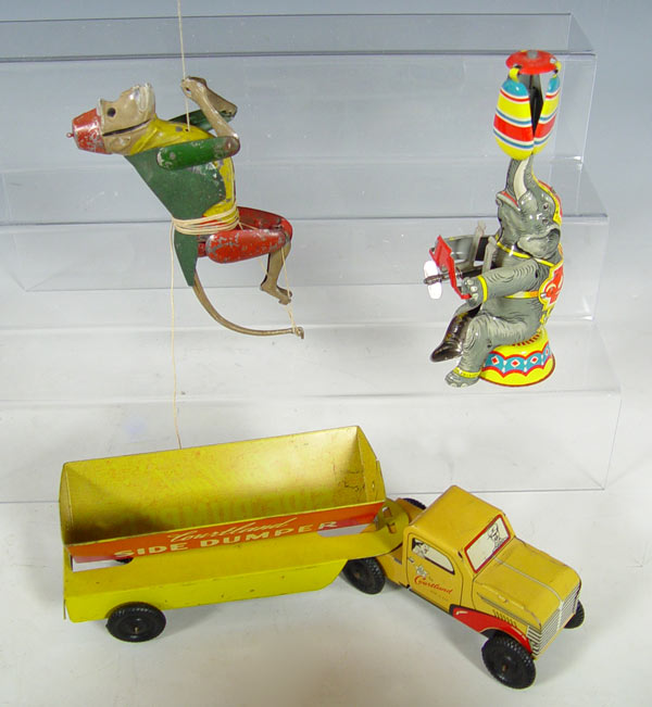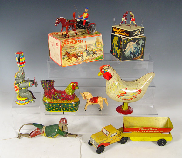 COLLECTION OF 8 TIN LITHO TOYS: Includes 1) Key wind German horse. 3'' h. 2) Wyandotte egg laying chicken with marbles 7 1/4'' h. 3) Baldwin clucking and egg laying chicken with wood eggs. 4 3/4'' h. 4) US zone Germany mechanical elephant with spinning fan top. 7 3/4'' h. 5) Walt Reach Courtland Side Dumper truck and trailer. 11 1/2'' long overall. 6) Biller Slugger Champions key wind with original box. Missing ropes, box missing top. 7) Arabian key wind jockey and horse with original box. Note box condition. Box measures 4'' x 7'' x4''. 8) Climbing Monkey mechanical string toy. 8'' high.