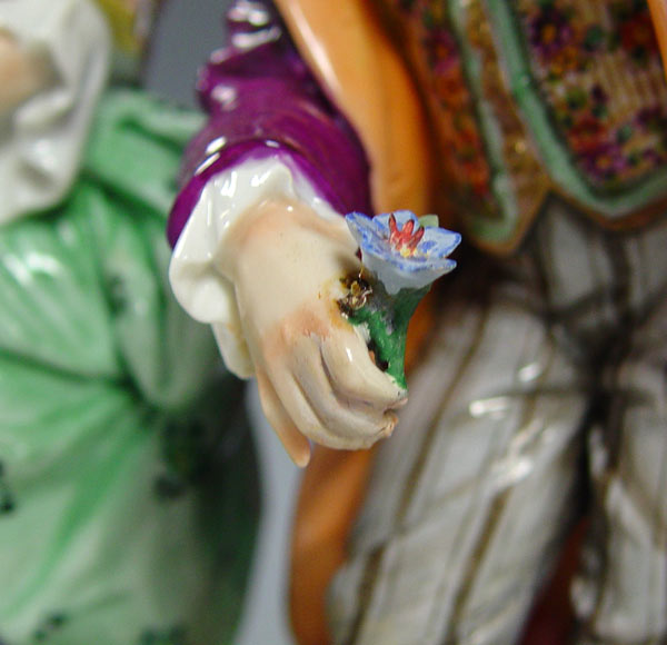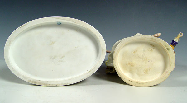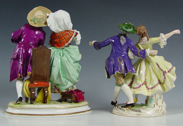 2 PORCELAIN FIGURAL GROUPS: 1) Capo-di-Monte, 11'' tall, crown N mark. 2) Unmarked, 9'' tall.