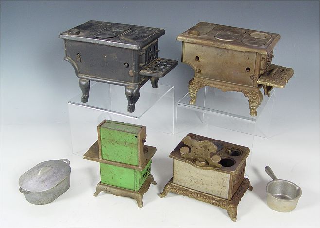 COLLECTION OF 4 CHILDS CAST IRON TOY STOVES: To include 1) ''Favorite'' with original green paint. 7 1/4'' h. x 5 3/4'' x 3 3/4''. 2) ''Eagle'' 7 3/4'' h. x 7 1/4'' x 5 1/4''. Missing 2 burner covers. 3) Unmarked 7 1/2 x 10 3/4'' x 5 3/4. 4) Unmarked with star front. 6 1/2'' x 10 1/4'' x 6 3/4''. Sold with cast aluminum covered pot and other pot.
