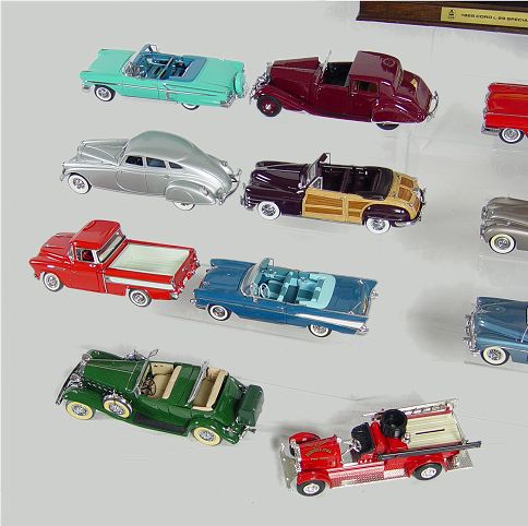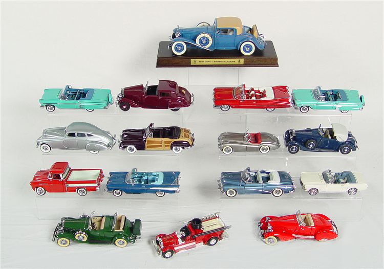 COLLECTION OF 16 DANBURY MINT MODEL CARS: Highlights include 1926 Mack AC Rotary pumper, 33 Pierce Arrow, 1966 Ford Mustang, 2 1958 Chevy Impala, large 1929 Cord L-20 Special Coupe. 13 have original boxes.
