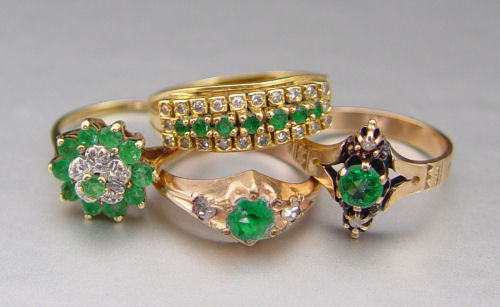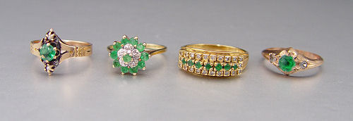 4 ESTATE FOUND EMERALD, & DIAMOND AND ANTIQUE RINGS: 1) 18K yellow gold emerald and diamond ring. 2) 10K yellow gold emerald and diamond ring. These two rings are sold along with an 3) 18K antique ring with green and white synthetic stones and a 4) 14K antique ring with green and pearl synthetic stones. Total emerald weight: .70 Ct. Approx. Diamond weight: .25 Ct. Approx. Gold Weight: 14K 2.7 grams. 10K 2.2 grams. 18K 6.5 grams. Est. $350/450**