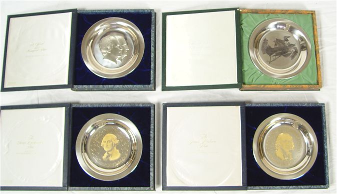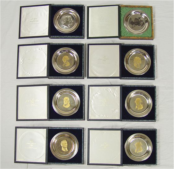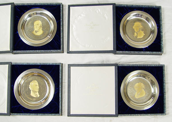 8 STERLING COMMEMORATIVE STERLING PLATES: Includes Presidential plates Jefferson, Adams, Monroe, Madison, Washington, Adams, Inauguration 1973. All from The White House Historical Association. Also included is a Franklin Mint Audubon ''The Wood Thrush''. All come in original presentation boxes. Plates measures 8'' dia. boxes 1 3/4'' x 10 1/4'' x 10 1/2''. Approx 54.6 troy oz.