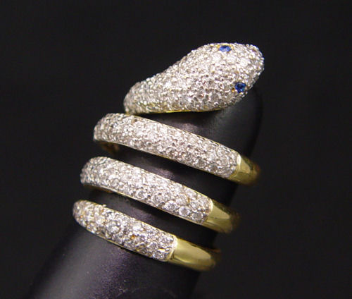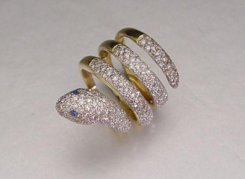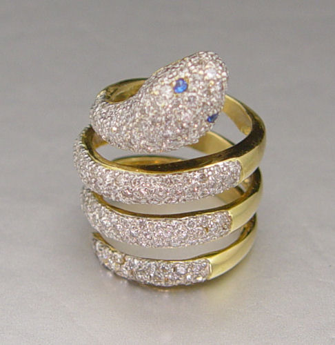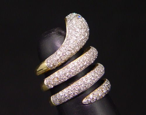 18K DIAMOND ENCRUSTED SNAKE FORM RING: 18K yellow gold ring coils around the lucky finger, with 206 round cut diamonds, approx. 2.60 Ctw., rated SI2 - I1, color H-J. 1 1/8'' length. Size 5. Weight 10.2 grams.