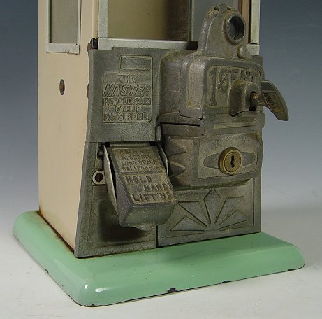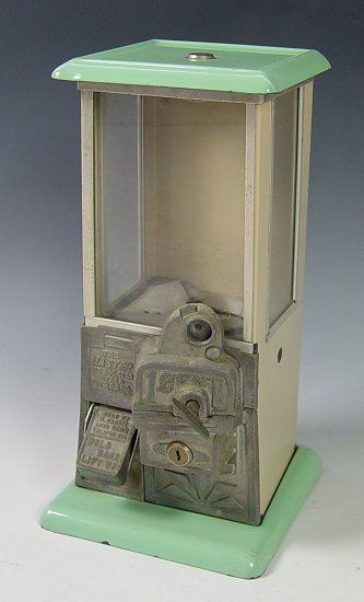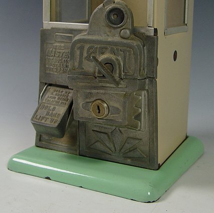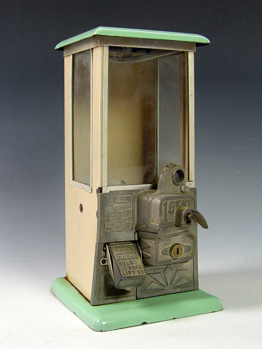 MASTER 1 CENT COIN OP GUMBALL VENDING MACHINE: In working order. Original jadeite green and cream enameled finish. 16'' x 7'' x 8''