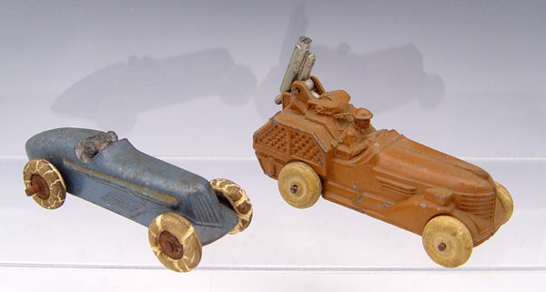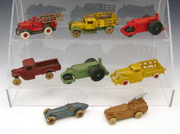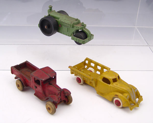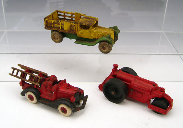 8 HUBLEY, ARCADE, BARCLAY CAST IRON TOY CARS: Includes 1) 2 Hubley Hercules Road Rollars, one green, one red. 2'' x 4 3/4''. 2) Arcade 214 red truck. 2'' x 4 3/4''. 3) Barclay anti aircraft Army car with movable gun. Note missing barrel. 2 1/4'' x 4'' 4) Unidentified yellow & green farm truck, stamped T54R-1. 1/ 1/2'' x 4 3/4''. 5) Unidentified yellow farm truck, stamped 2217. 1 1/2'' x 5 1/8''. 6) Unidentified Barclay? two man roadster. 1 1/4'' x 4 1/8''. 7) Unidentified fire truck stamped 2157. 2'' x 5 1/8''.