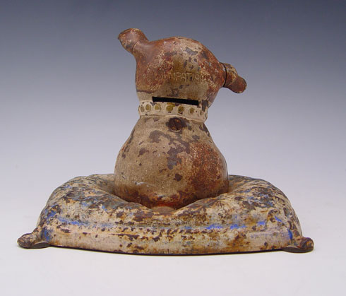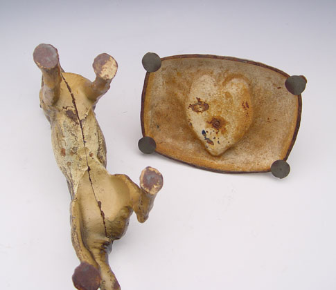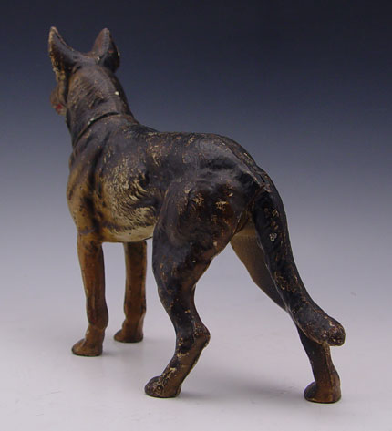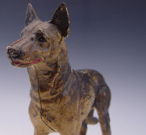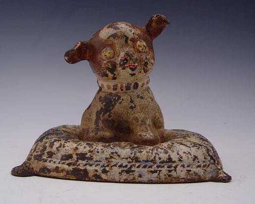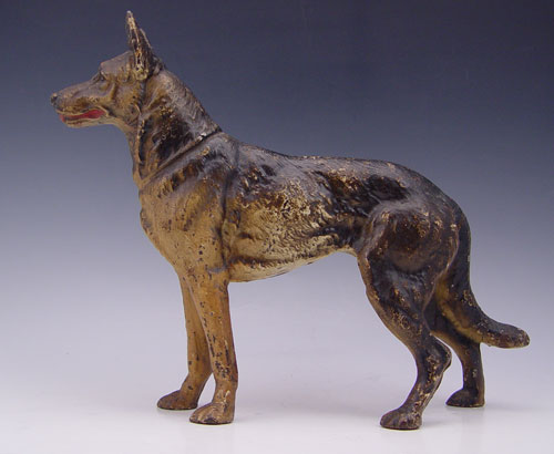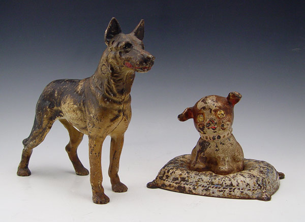 CAST IRON HUBLEY DOG BANK & GERMAN SHEPHERD DOORSTOP: To include 1) German Shepherd doorstop. 10'' h. x 13 1/2''. 2) Hubley Fido on Pillow still bank. 5 3/4'' h. x 7 1/2''.