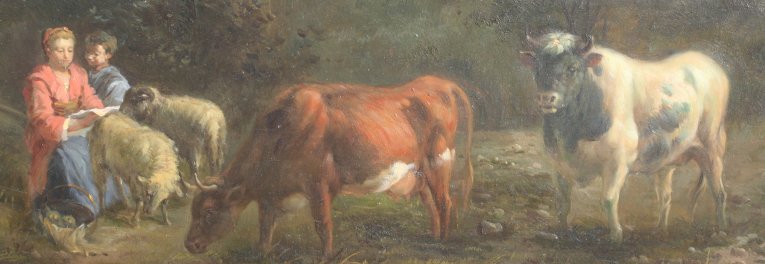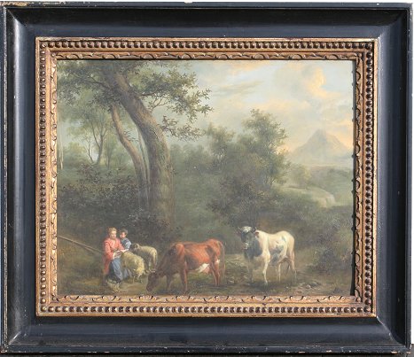 FIGURES AND COWS IN A LANDSCAPE AFTER BERCHEM: OIL/Cradled Panel, 15 3/4'' x 20'', no visible signature, ebonized frame with wear, 22 1/2'' x 26 1/2''. Est. $300/500**