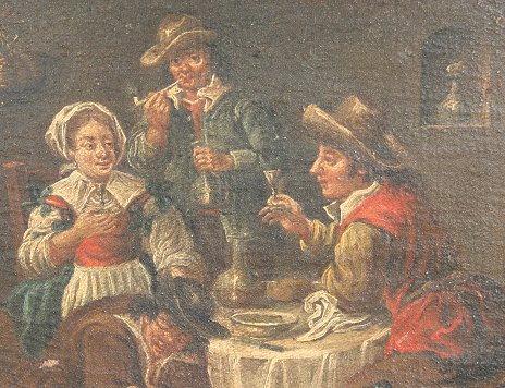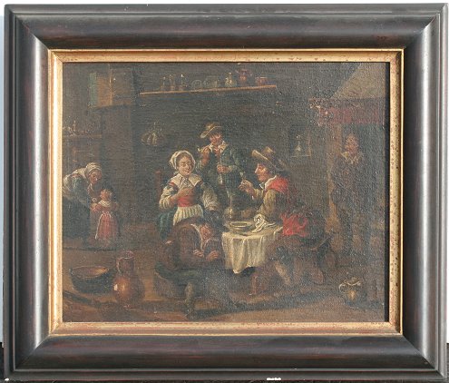 EARLY PAINTING OF A DUTCH INTERIOR SOCIAL SCENE: OIL/Canvas, 15 1/4'' x 17 3/4'', no visible signature, framed, 20'' x 23 1/2''. Est. $300/500**