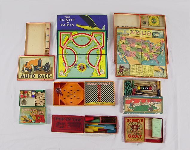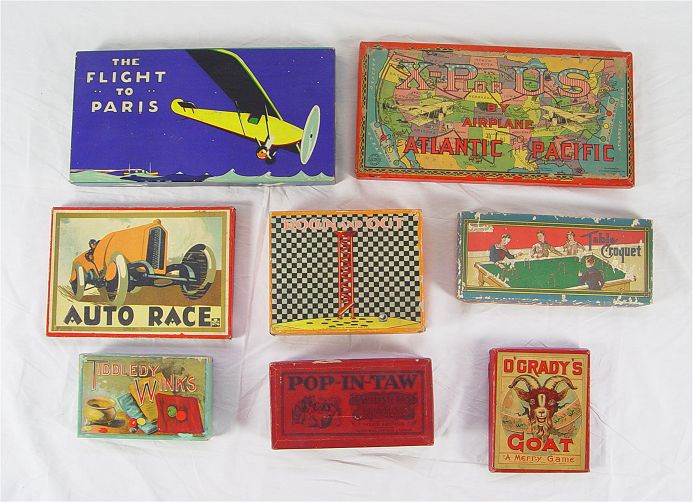 COLLECTION OF 8 VINTAGE BOARD GAMES: To include 1) Down and Out, Milton Bradley 1909. 2) Pop-In-Taw, Parker Brothers. 3) Table Croquet, Pressman & Eibtz. 4) Auto Race, Clover. 5) O'Grady's Goat, Milton Bradley. 6) Tiddlely Winks, Milton Bradley. 4105 green box. 7) X-Plor US by Airplane, All Fair Toys & Games, 1922 8) The Flight to Paris, Milton Bradley, 1927.