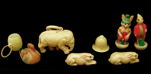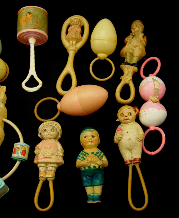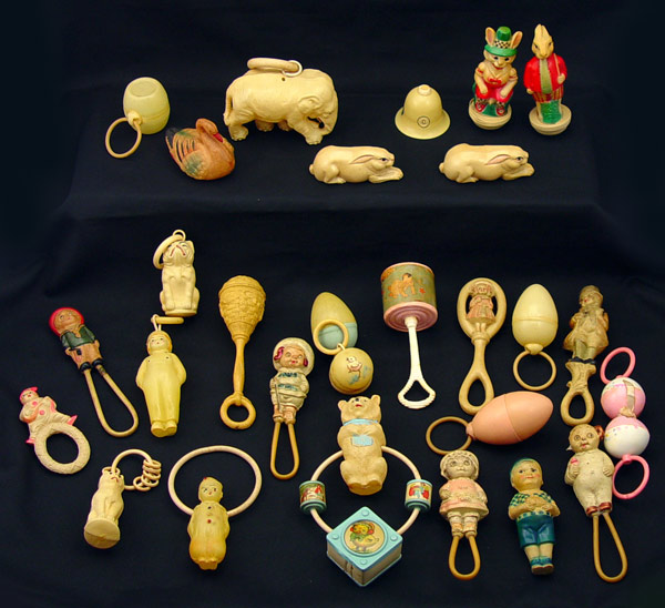 COLLECTION OF CELLULOID BABY RATTLES & INFANT TOYS: Approx. 28 pieces, in assorted shapes & sizes. Includes rattles, teethers and push overs. All pieces intact. Largest piece (elephant) measures 4'' x 4 1/2'' x 2''.