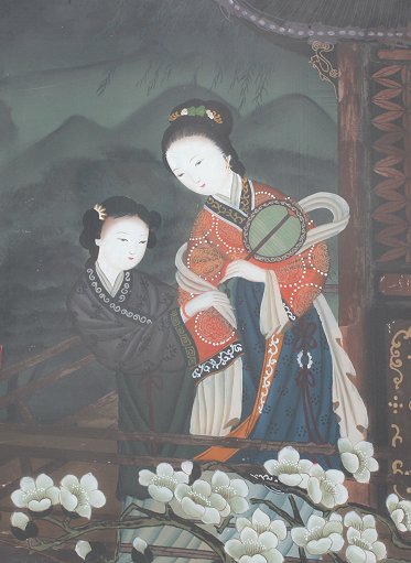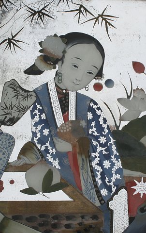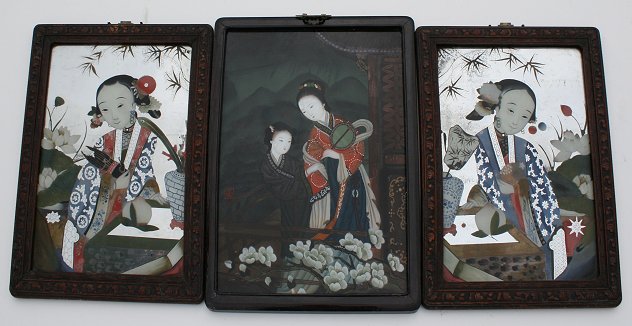 3 ORIENTAL REVERSE PAINTINGS ON GLASS: 2 works on mirrored glass are earlier, possibly 19th C., 20'' x 14 1/2'', matching frames, 22'' x 16 1/2''; on glass, 22 1/2'' x 16'', lacquer frame, 23 1/2'' x 17 1/2''.