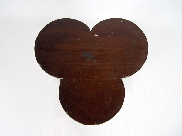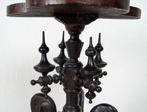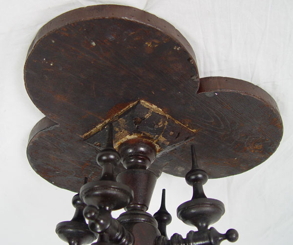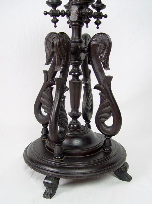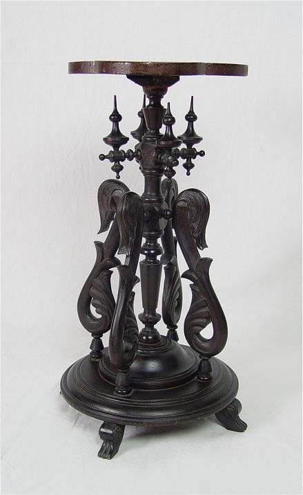 VICTORIAN BLACK WALNUT FERN STAND: Finely detailed turnings with gooseneck style carvings creating support for the clover leaf shaped top. Turned base with paw feet. 17'' round, 28'' tall.