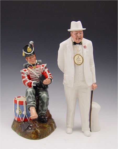 2 ROYAL DOULTON MEN FIGURES: Winston Churchill, HN 3057, 10 1/2'' tall. Drummer Boy, HN 2679, 8 3/4'' tall.