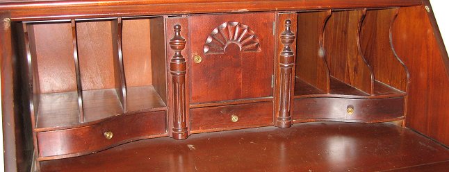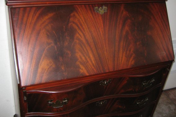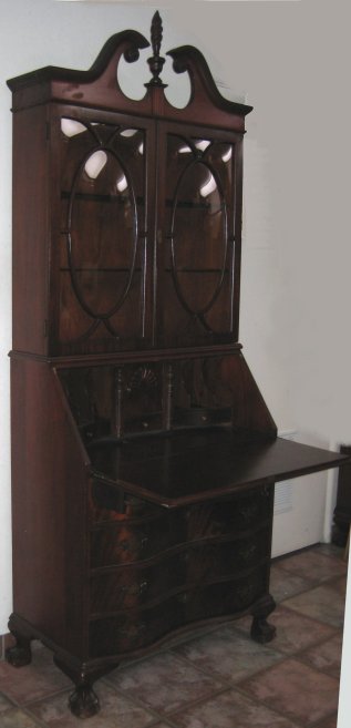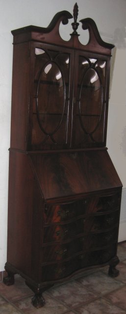 GOVERNOR WINTHROP STYLE FLAME GRAIN MAHOGANY BALL AND CLAW FOOT SECRETARY DESK: Broken pediment with turned flame finial, bubble glass, 85'' h., 32 1/2'' w., 18'' d.