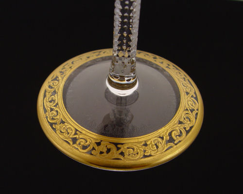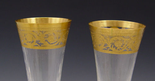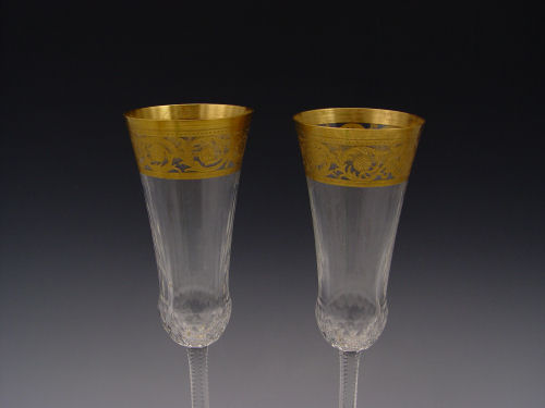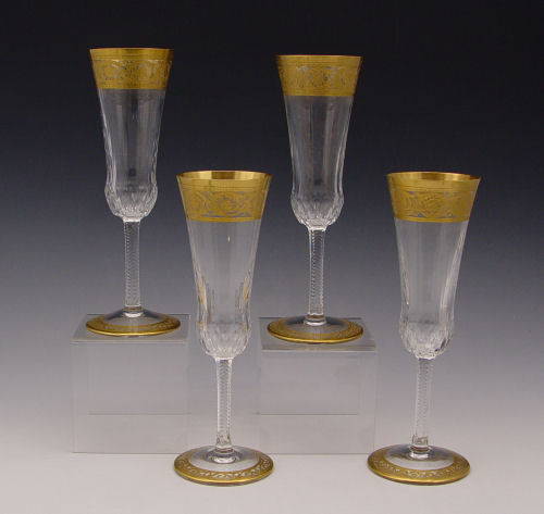 SET OF 4 ST. LOUIS GOLD GILT ENGRAVED CHAMPAGNE FLUTES: Clear crystal, gold encrusted in the Thistle pattern. Signed. Measure 7 1/2'' h.