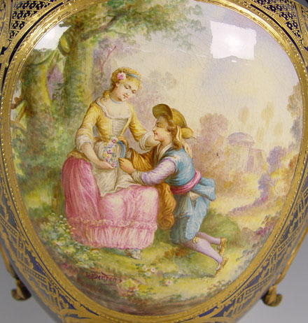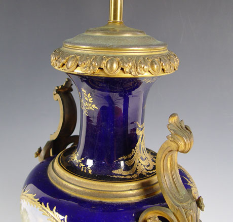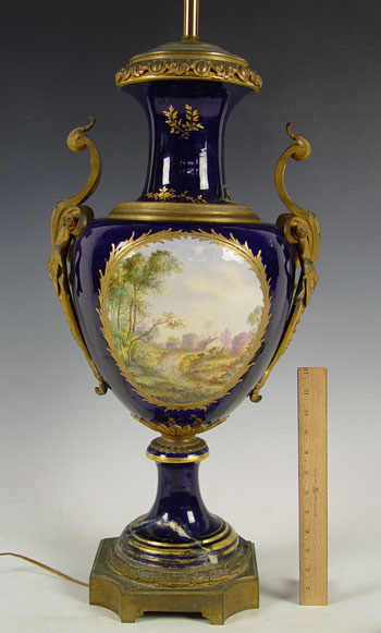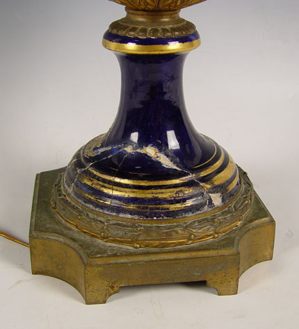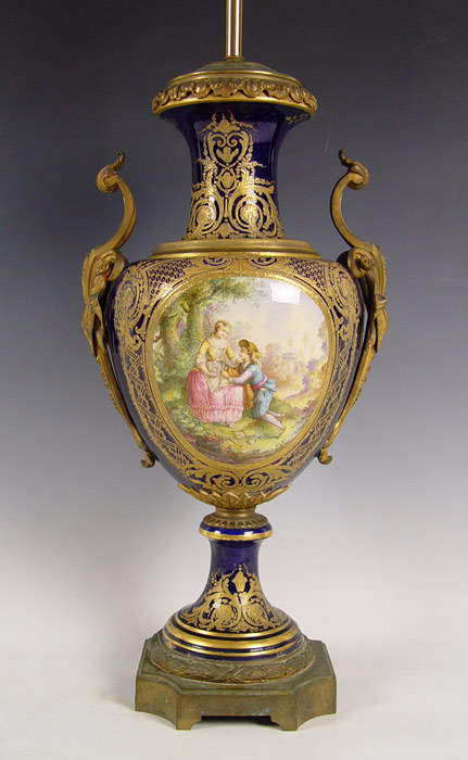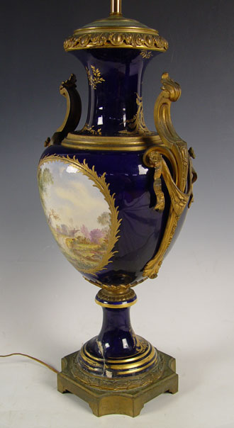 SEVRES FRENCH PORCELAIN URN MOUNTED AS A LAMP: Artist signed L. Bertren. Substantial damage to base of porcelain. Bears the Sevres cartouch mark. The porcelain is 24'' h, the lamp is 44'' h. overall.