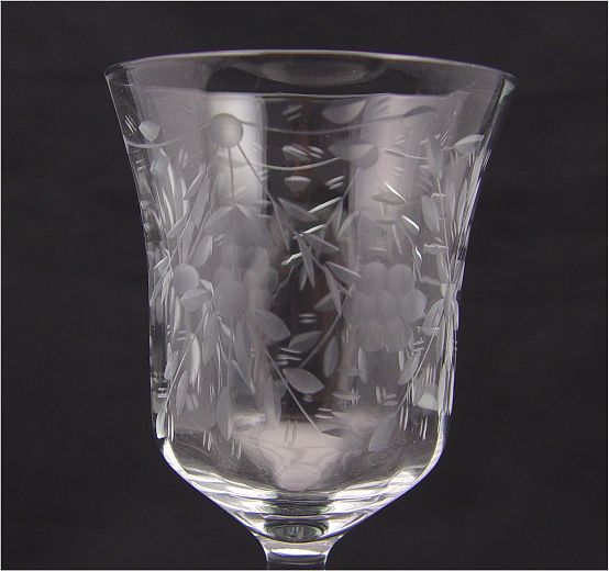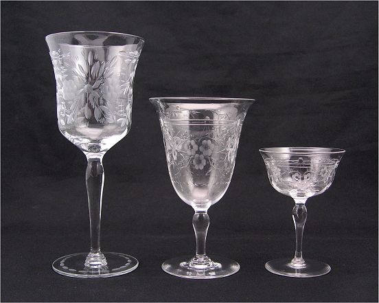 WEBB CORBETT INTAGLIO ETCHED CRYSTAL STEMWARE CA. 1930-1947: 24 piece suite to include 10 low goblets (5 3/4''), and 14 cordials (4''). Sold with a set of 12 goblets (8'') in a complimentary pattern, maker unknown.