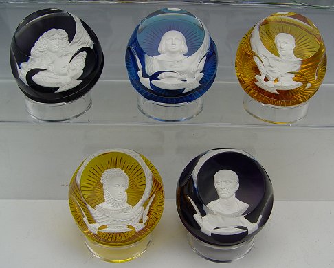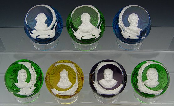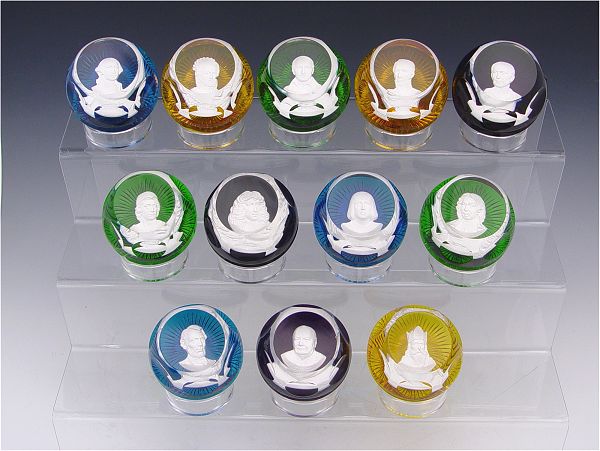 GROUP OF 12 BACCARAT CRYSTAL SULPHIDE PAPERWEIGHTS: Charlemagne, Churchill, Washington, Lincoln, Joan of Arc, Simon Bolivar, Alexander the Great, Caesar, Louis XIV, Queen Elizabeth, Napoleon and Peter the Great. Sold with the Lucite display stands.
