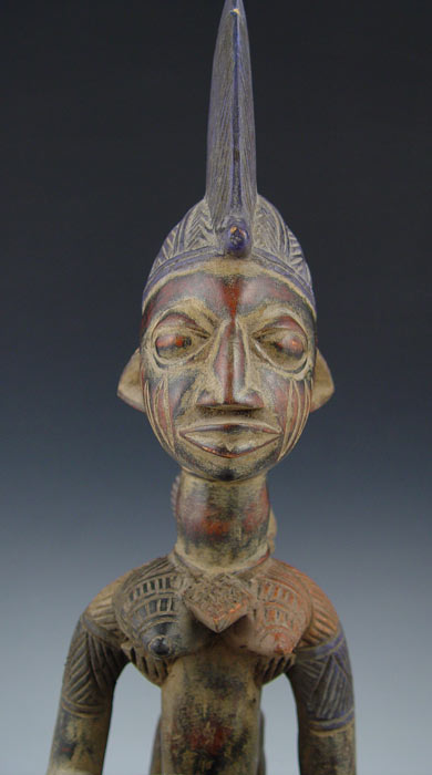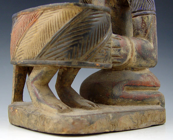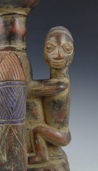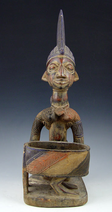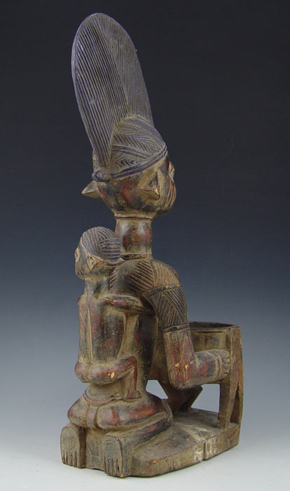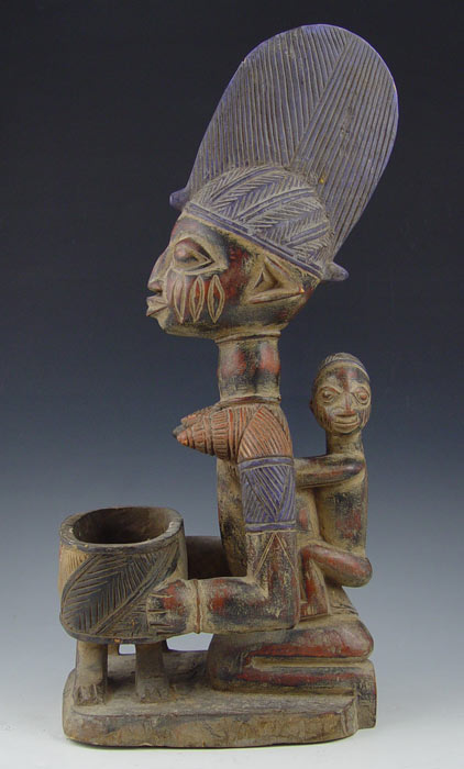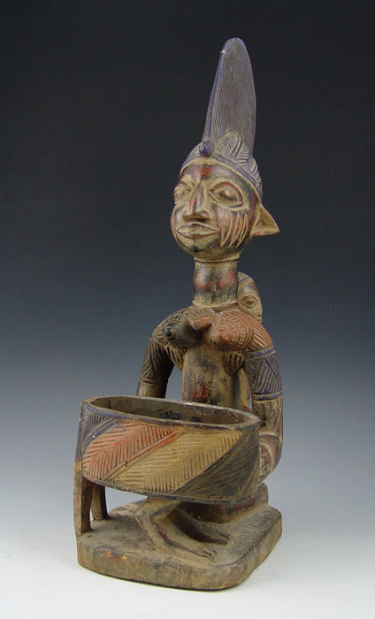CARVED WOOD AFRICAN WOMAN WITH BOWL: Figural woman with child on back and bowl figural animal paw feet on bowl. 17 1/2'' h.