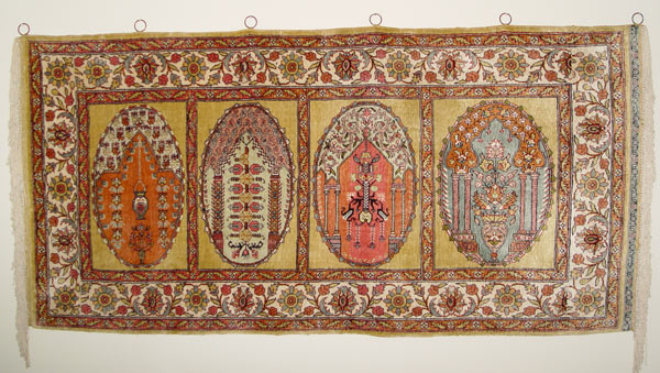 PRAYER RUG: Approx. 2' x 4'2'', rings attached for hanging, never been used on the floor.