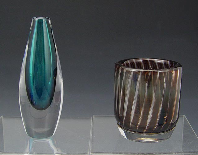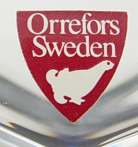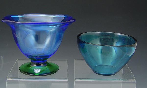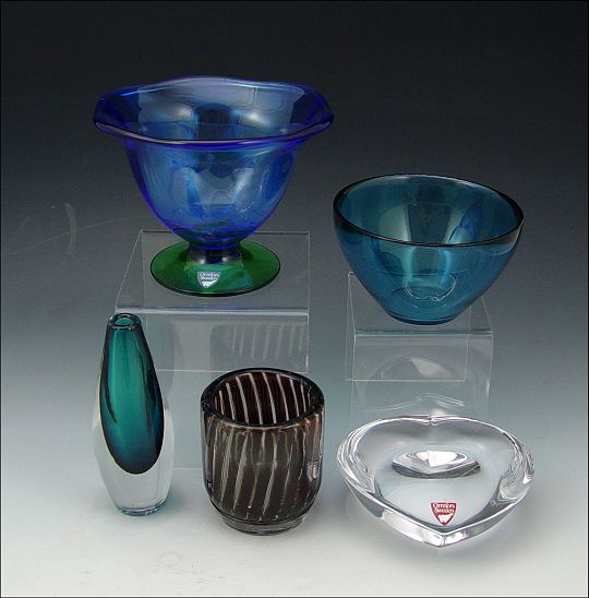 SWEDISH ART GLASS GROUP: 1) Edvin Ohrstrom Orrefors Ariel votive, etched ''Orrefors Ariel 213 ? Edvin Ohrstrom'', 2 7/8''. 2) Orrefors pedestal bowl, 4 1/4'' tall. 3) Palmquist Fuga bowl, made using centrifugal force, marked ''Fuga Orrefors'', 2 1/2''. 4) Orrefors crystal heart paperweight, 4'' length. 5) Signed Kosta mini vase, 4 1/2'' tall. Five gifts in one purchase.