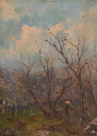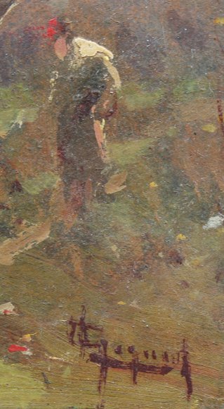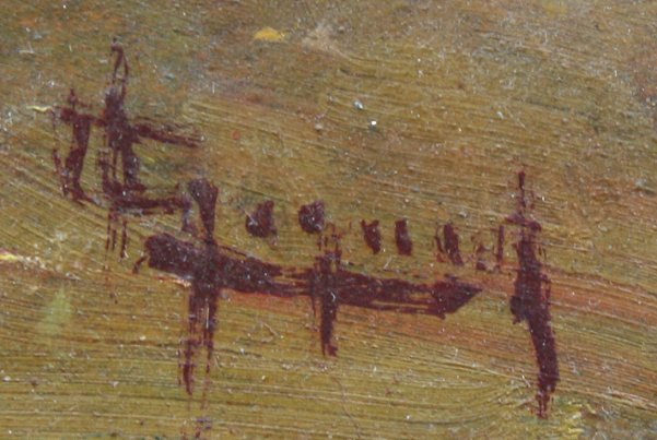 ILLEGIBLY SIGNED EUROPEAN LANDSCAPE PAINTING: OIL/Board, 11 5/8'' x 8 3/8'', signed lower right, gilded frame with wear, 14'' x 12''. Est. $300/500**