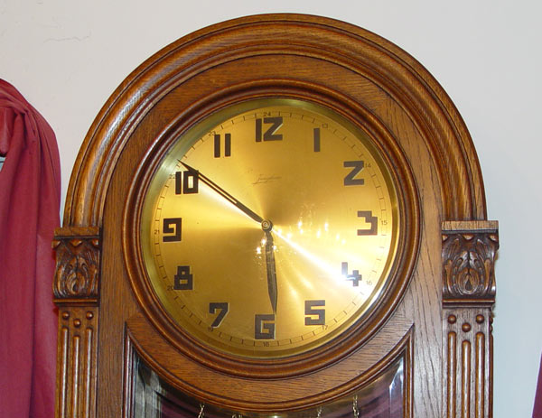 JUNGHANS ART DECO GRANDFATHER CLOCK: Circa 1930's, brass face with Arabic numerals. Rounded top with squared half columns. Rope twist base, on 4 feet. 81'' h x 23 1/4'' x 12 1/2''
