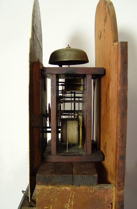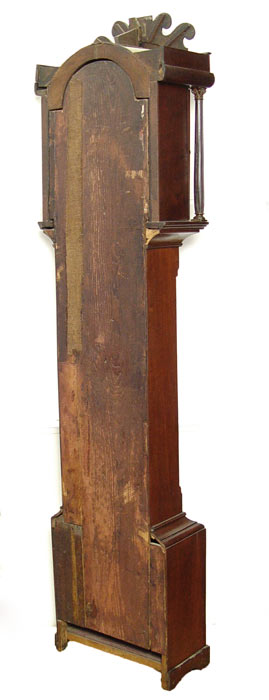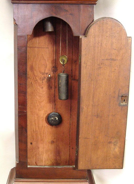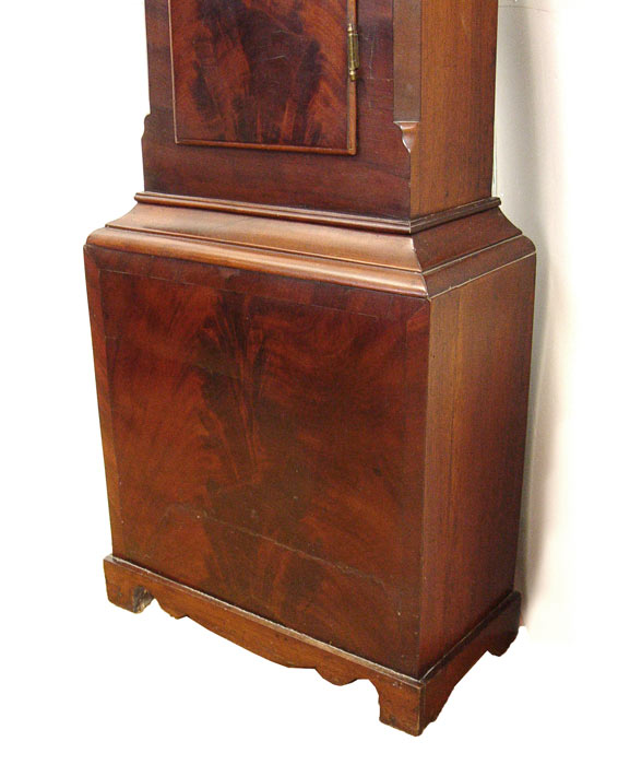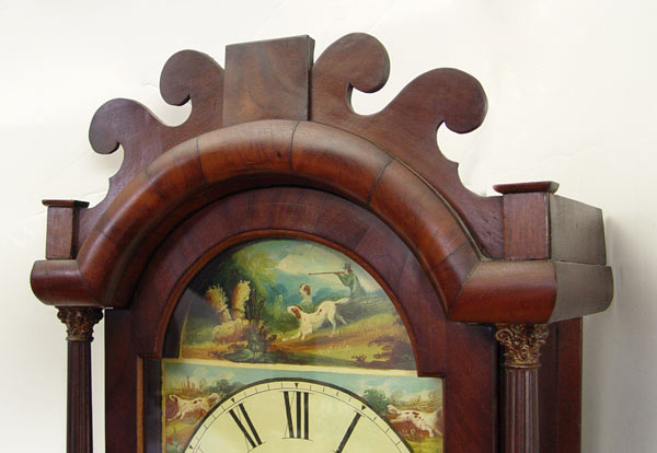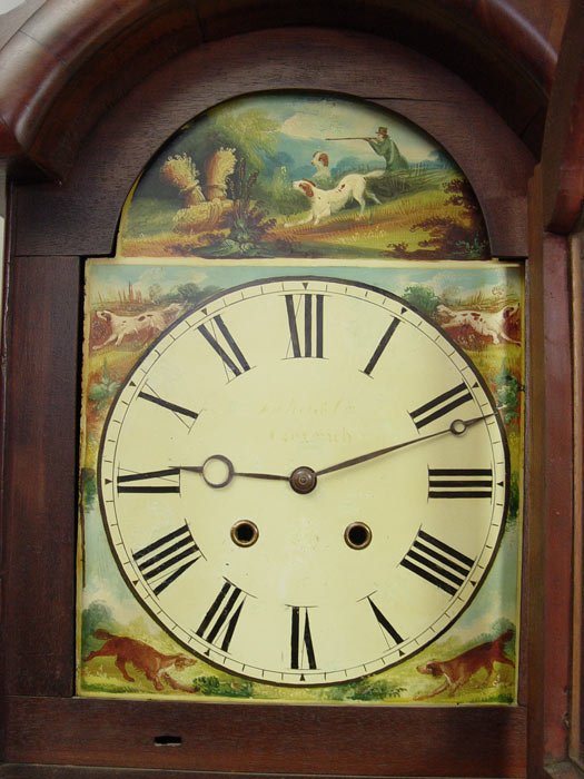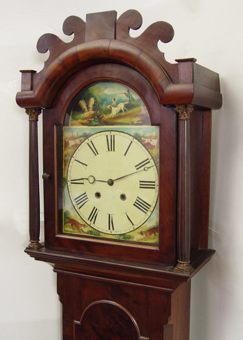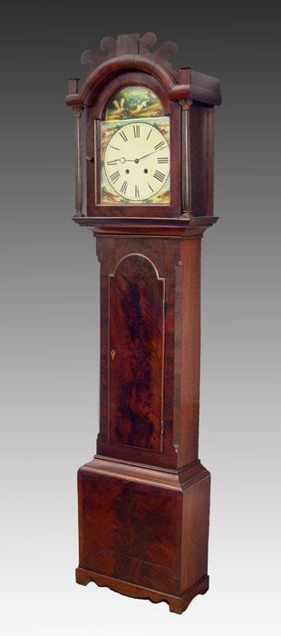 19th C TALL CASE CLOCK: Irish or Scottish. Flame grained mahogany veneer. Arched bonnet with cut pediment. The tombstone shaped face has been repainted, covering the makers name, and depicts hunter and hounds, Roman numerals. Complete with works, pendulum and weights. 83'' tall x 20 1/2'' x 10'' deep.