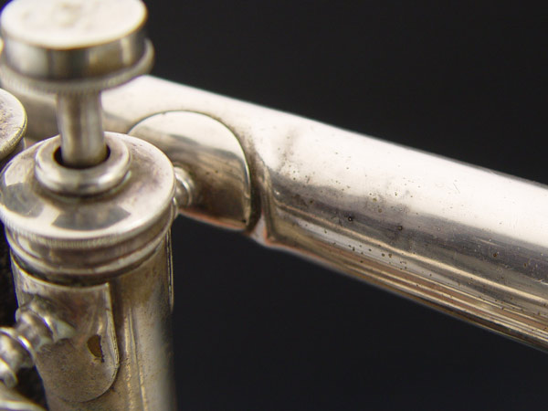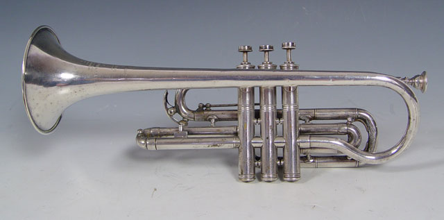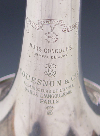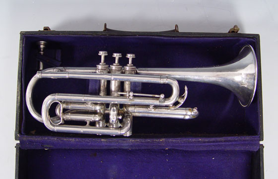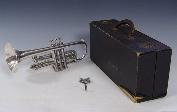 COUESNON & CIE FRENCH SILVERPLATE TRUMPET CA. 1921: Model made popular in the Paris Exposition of 1900. HN White mouthpiece. Trumpet is 16'' length. Case is from the Fillmore Music House of Ohio.