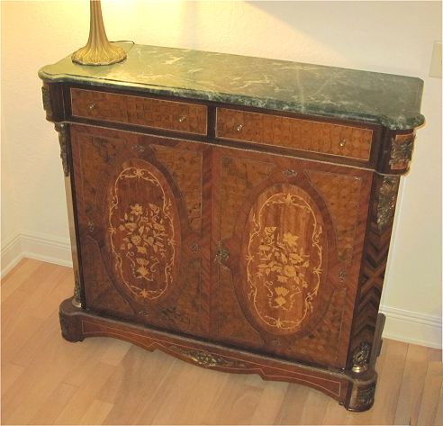 FRENCH MARBLE TOP PARQUETRY INLAY SIDE CABINET: Double doors with marquetry inlay. 41 1/2'' h. x 47'' x 16 1/4''