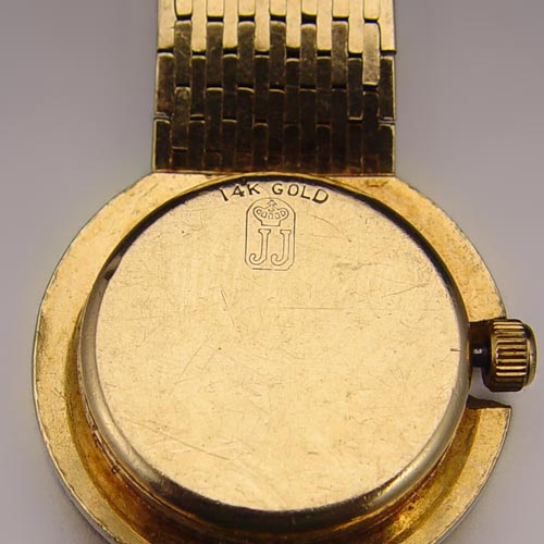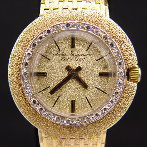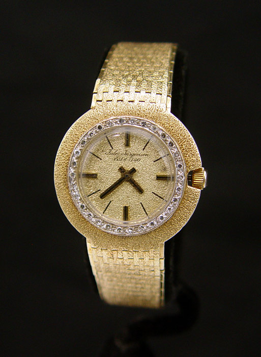 JULES JURGENSEN LADIES 14K GOLD AND DIAMOND WRIST WATCH: Signed, solid 14k gold watch with diamond accent bezel, approx. .25ctw, Swiss made movement in good working condition, new crystal, attached bracelet band in very good condition with no kinks noted, adjustable ladder style clasp, approx. 6 3/4''l., 37.6 grams overall. The case, band, movement and dial are all signed Jules Jurgensen.