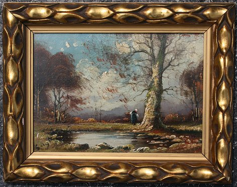 ILLEGIBLY SIGNED BARBIZON LANDSCAPE WITH FIGURE COLLECTING FIREWOOD: OIL/BOARD, 8'' x 11 1/2'', carved and gilded gesso frame, 11'' x 14''. Est. $300/500**