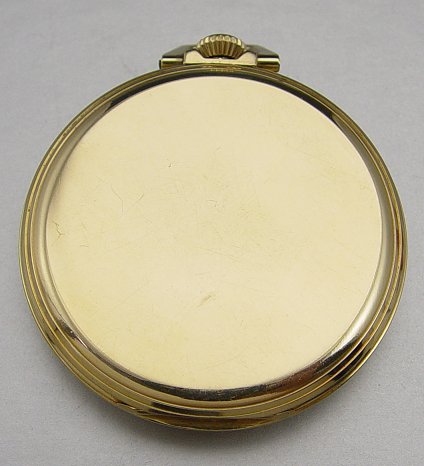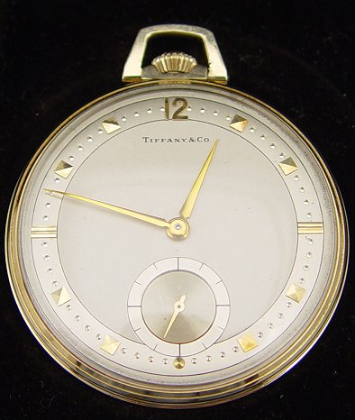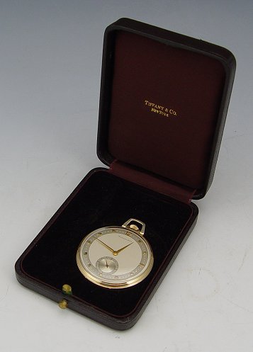 TIFFANY & CO. ART DECO 14K GOLD POCKET WATCH: Art Deco 14K yellow gold openface pocketwatch in original presentation box. Manufactured by Hamilton for Tiffany & Co. The movement is Hamilton caliber 921, 21 jewels, with 5 position adjustment, Damaskeening Swiss style strips. Dial in excellent condition with Art Deco numerals, signed Tiffany & Co. Weight 62.5 grams. In working condition, case is approximately 1 3/4'' in diameter.
