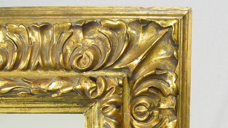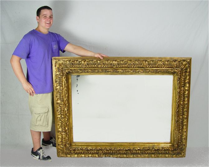 EARLY 19TH C GILT WOOD MIRROR: Deep carved wood frame, gesso and gilded. Nice patina. Replaced mirror support. 45 1/2'' x 58 1/2'' x 5'' deep.