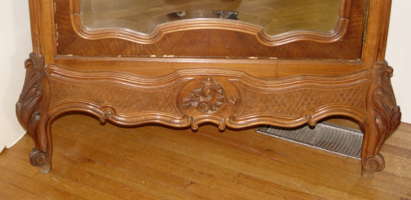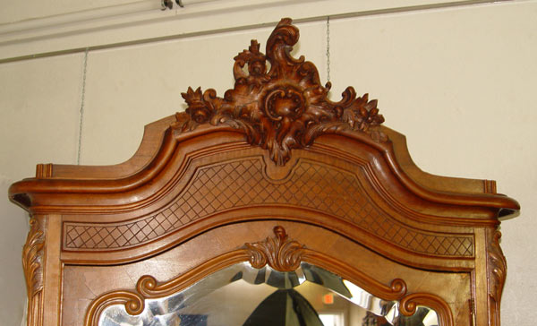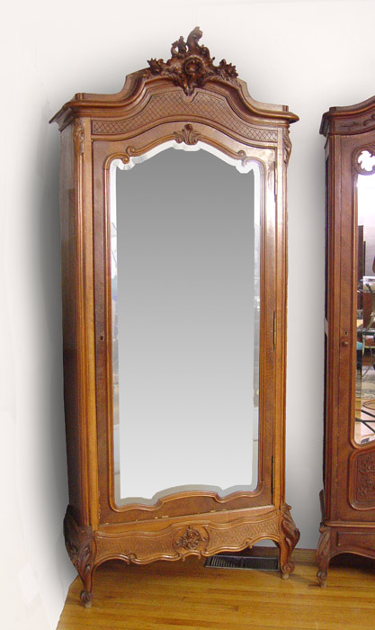 19TH C FRENCH WALNUT ARMOIRE: Single beveled mirror door with carved trim. Molded bonnet top with carved crest and French feet. Measures 100'' h. x 44'' x 23''.