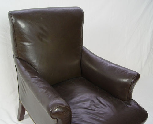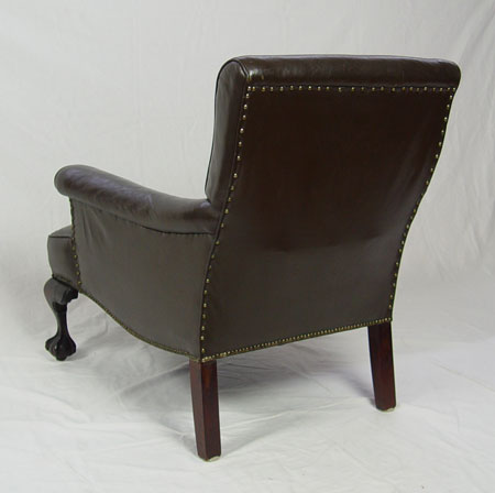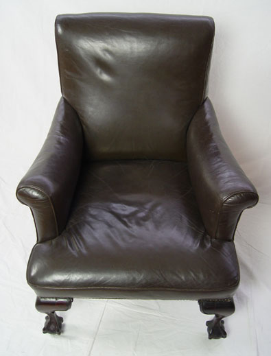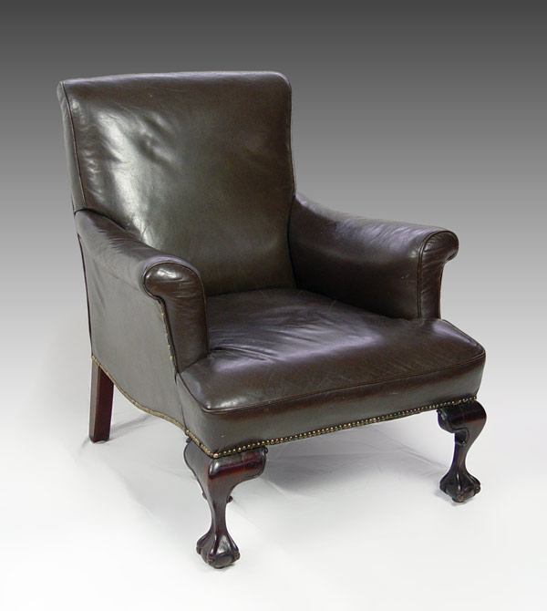 BALL AND CLAW FOOT LEATHER LIBRARY CHAIR: Chocolate brown leather with brass studs. Carved mahogany claw feet. 37 1/2''tall x 37'' x 37 1/2''. Est. $500/800**