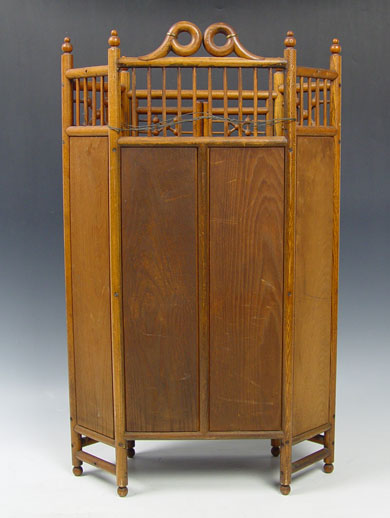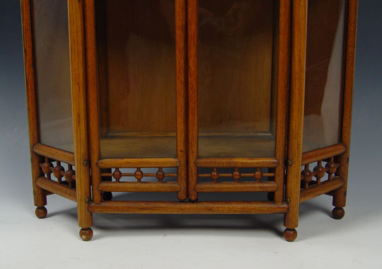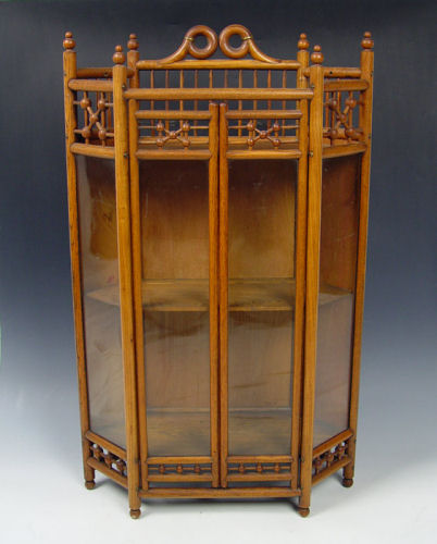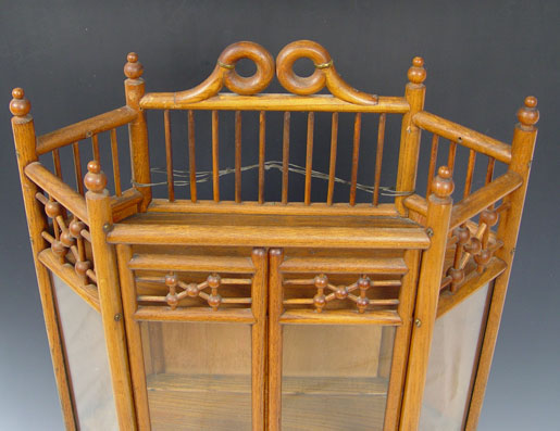 VICTORIAN STICK AND BALL HANGING CUPBOARD: Unusual six sided cabinet with 2 glass doors, and 2 glass side panels under a detailed gallery. Single interior shelf. 35'' tall x 21'' x 9'' deep.