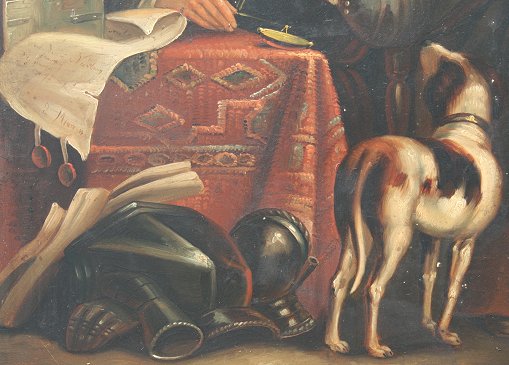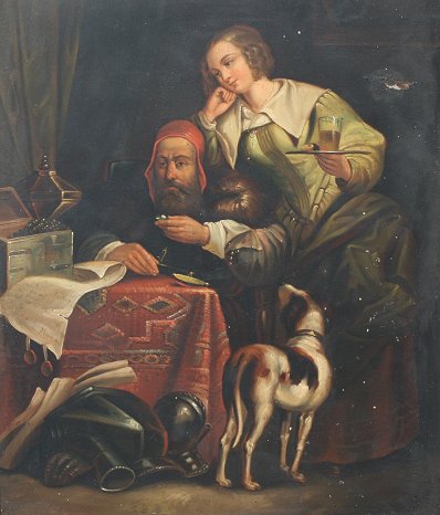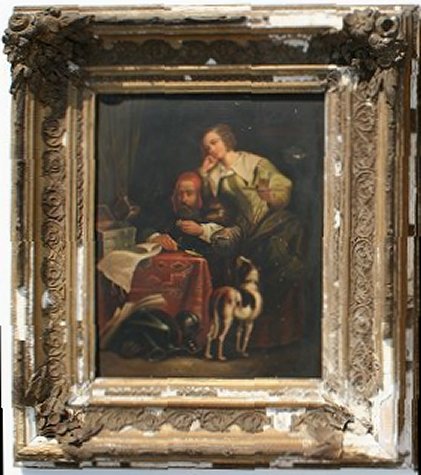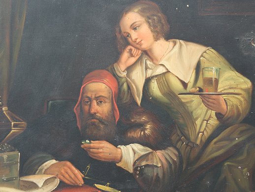 19th C. GENRE SCENE OIL/TIN, ''THE JEWELLER'': Depicts an elder man eyeing a loose stone with female looking on, 11 1/2'' x 9 1/2'', period gilded gesso frame with wear and loss of gesso, 18'' x 16''.