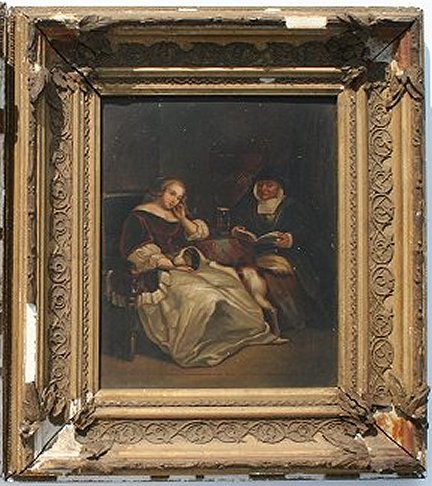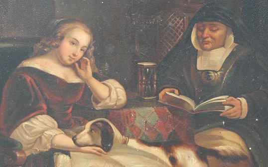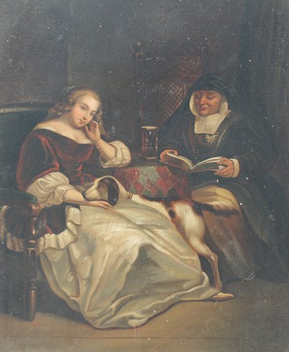 19TH C INTERIOR SCENE YOUNG AND DOG WITH NUN, 11 1/2'' x 9 1/2'', period gilded gesso frame with wear and loss of gesso, 18'' x 16''.