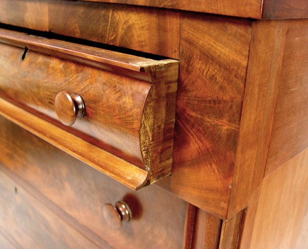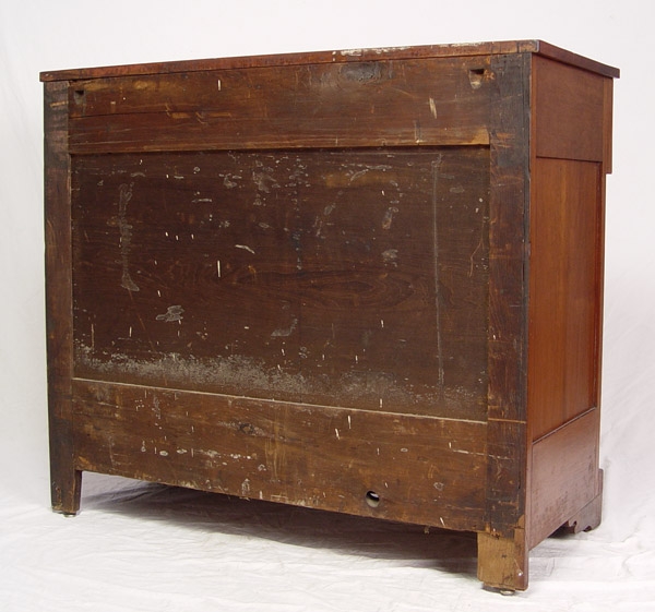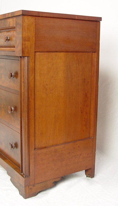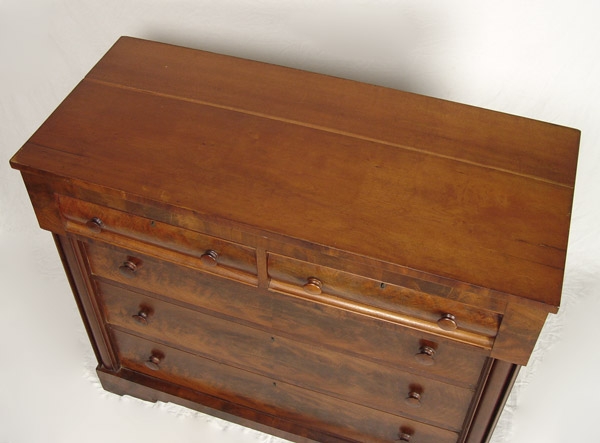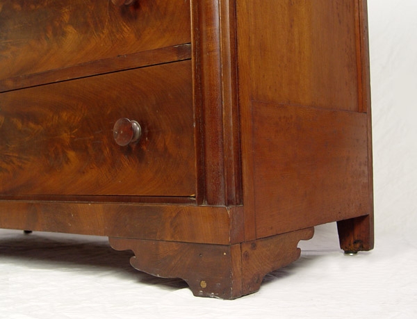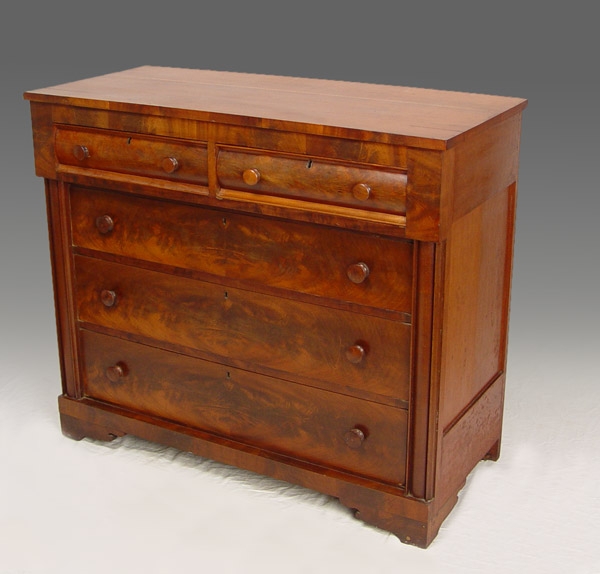EMPIRE MAHOGANY VENEER 2 OVER 3 DRAWER CHEST: Flame mahogany matched veneer drawer fronts, wood pulls and curved half column front corners, simple cut bracket base, 39''h. x 45 1/2'' x 20''.