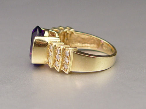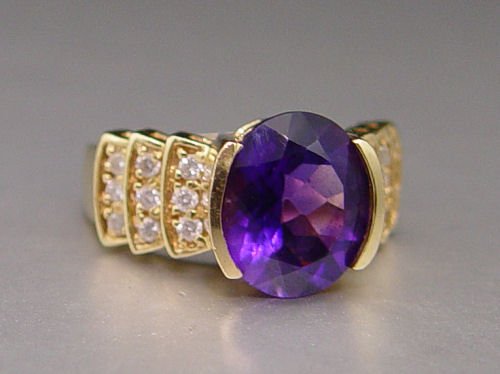 4.5 CT AMETHYST WITH DIAMONDS RING: 14K yellow gold ring centers a 4.5 Ct. oval amethyst flanked by 18 round full cut diamonds, approx. .36 Ctw.,rated I1 - I2, color I-J. Size 7. Weight 7.2 grams
