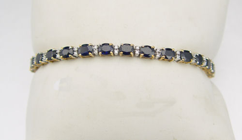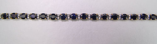 18K SAPPHIRE AND DIAMOND LINE BRACELET: 18K white gold with yellow gold plate bracelet. 56 round full cut diamonds, total approx. .5 Ctw., rated VS- SI in clarity and H-I color. The diamonds alternate with 28 oval shaped mixed cut sapphires, average VS in clarity (Type II), B in Hue , 8 in tone and 3 saturation. Diamonds and sapphires are prong set. Locking closure with safety clasp. Sold with current Florida Diamond Appraisers GIA graduates appraisal for $2,750.