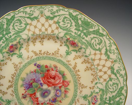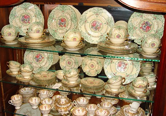 BLACK KNIGHT GOLD LATTICE, SCROLL AND FLORAL DECORATED CHINA: Pattern 8376. 67 pieces to include 12 dinner or service plates (10 1/2''), 10 bread plates, 11 cream soups, 10 underplates to the soups, 12 cups and 12 saucers.