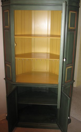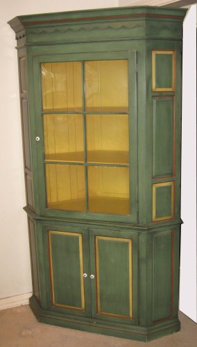PAINTED CORNER CUPBOARD: Upper section with glass front door, lower behind doors. Molded and scalloped crest, paneled sides. The painted interior has been fitted with florescent lights. Measures 78 1/4'' high x 45 1/4'' across.
