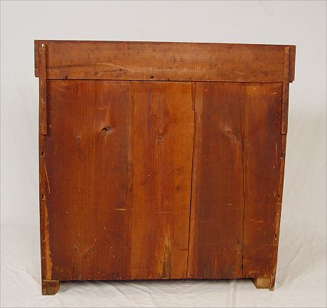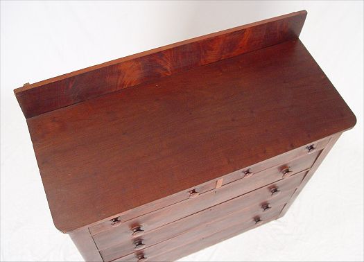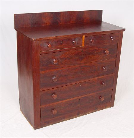 EMPIRE TO EARLY VICTORIAN CROTCH GRAIN MAHOGANY CHEST OF DRAWERS: Two over 4 drawers, straight bottom, wood knob pulls, backsplash. 35''h plus the 5'' backsplash x 40'' x 17''.