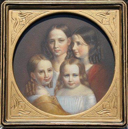 SUPERIOR W/C GOUACHE PORTRAIT OF FOUR SISTERS: No visible signature, 6 1/4'' diameter, encased in carved and painted frame, 8'' x 8''. Est. $400/600**