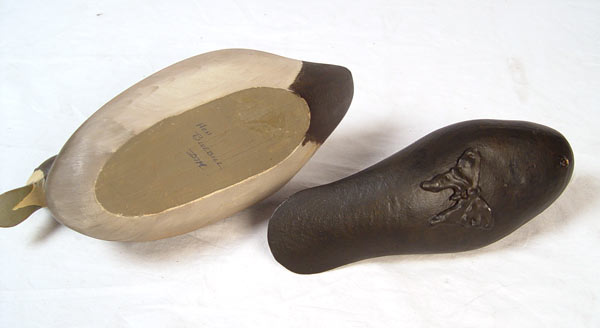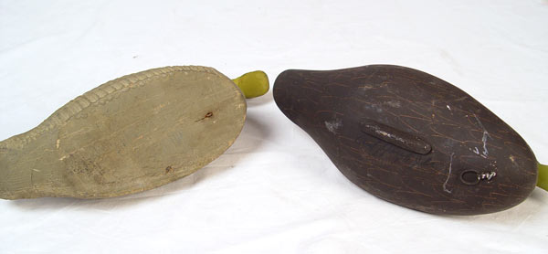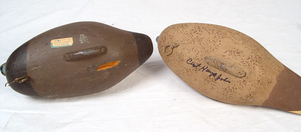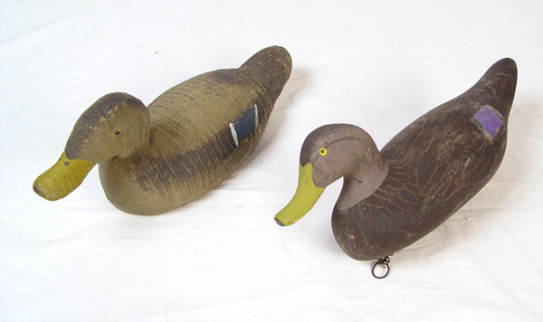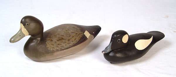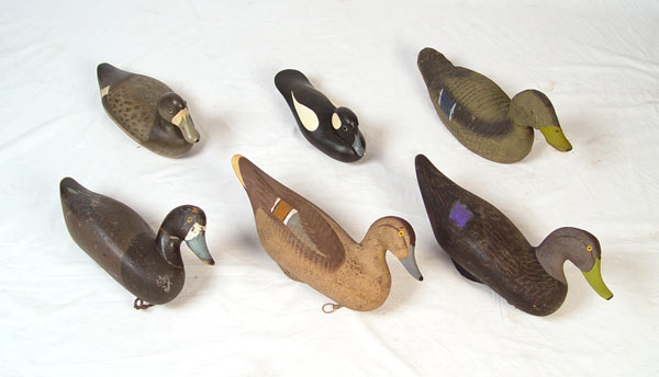 COLLECTION OF 6 VINTAGE DUCK DECOYS: To include 1) Rob Daley, goldeneye. 2) Pair Harry Jobes black ducks, hen & drake. 3) Rock Hall Maryland bluebill. 4) Animal Trap factory duck. 5) Unknown bluebill initialed DTM.